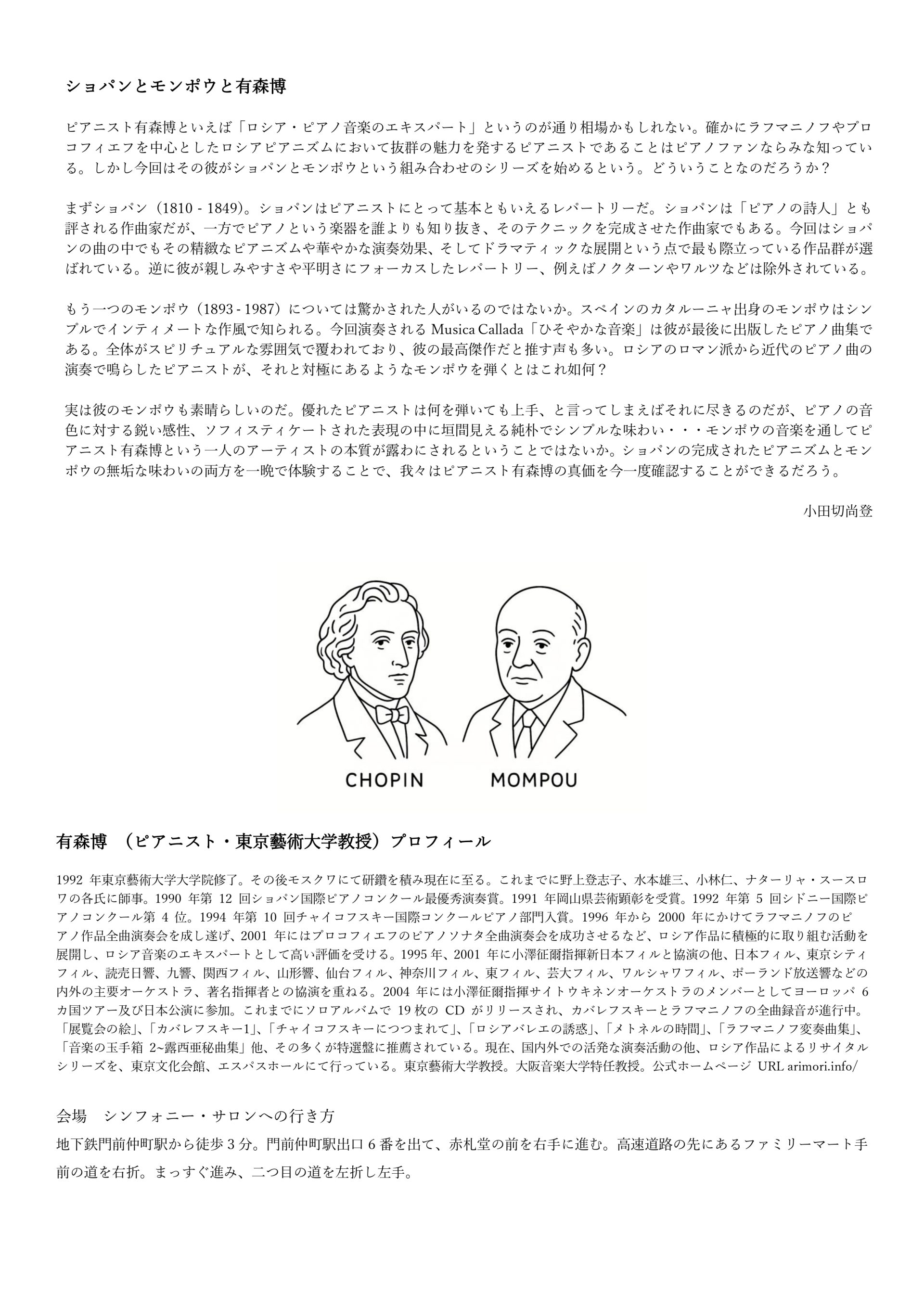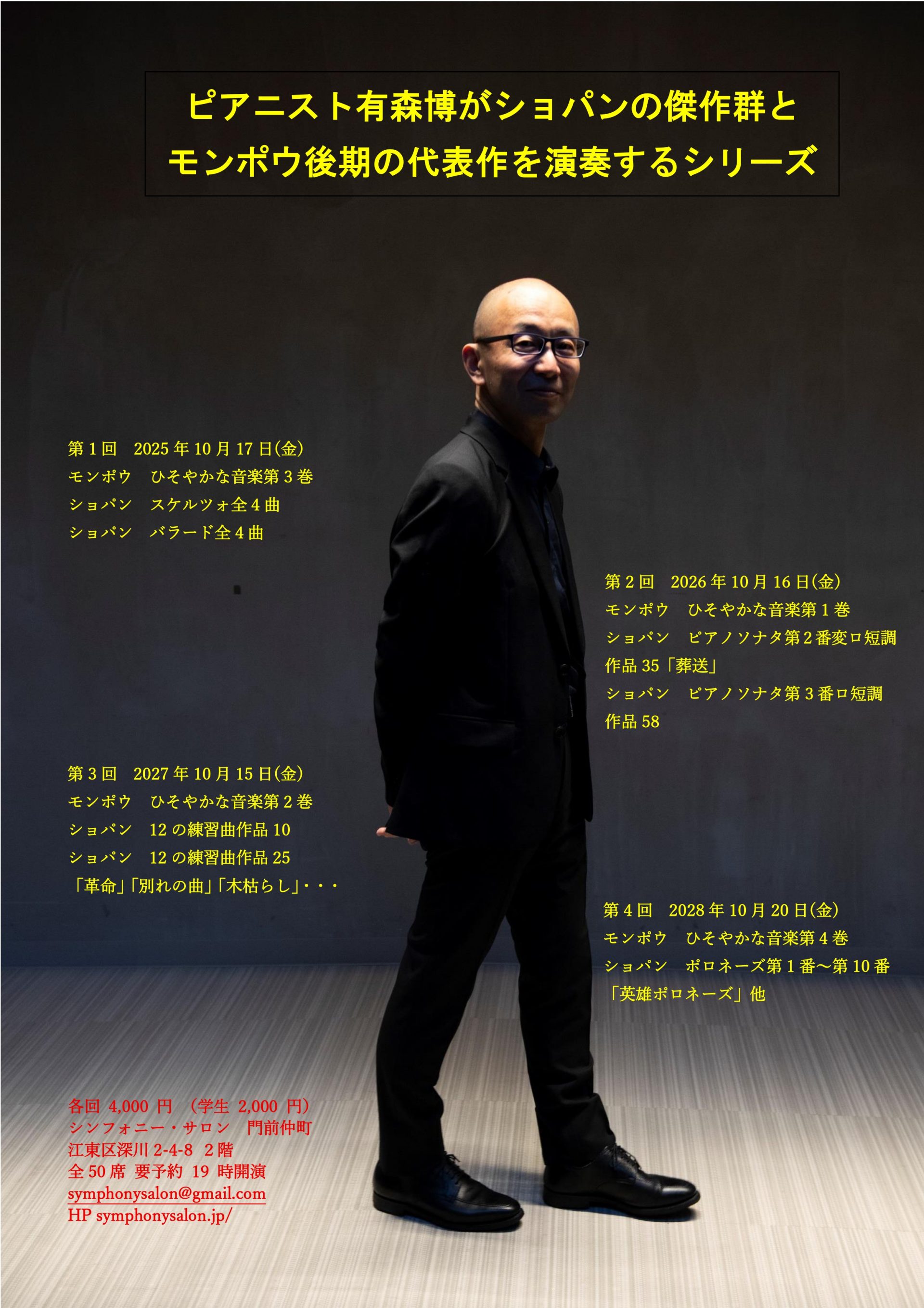 有森博(ピアニスト・東京藝術大学教授)によるショパンの傑作群とマンポウ後期の代表作を演奏するシリーズを開催します。